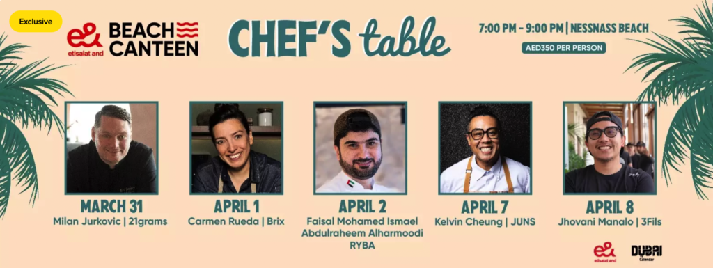 Chefs table is another event with back-to-back days for you this Eid! An exclusive collaboration with Michelin-recognised Dubai-based chefs brings a brand-new experiential dining concept to e& Beach Canteen on the 1st and 2nd of April! (Get tickets HERE)